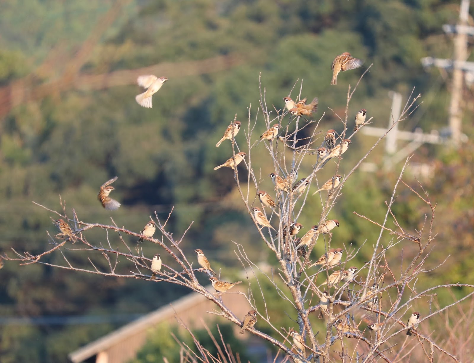 昨日米大好きなスズメは鈴なりに木にいました。