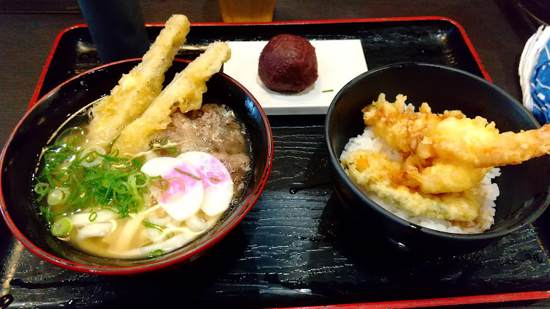 「しあわせセット」のごぼう天うどん、ミニ天丼,ぼたもちが運ばれてきました。
